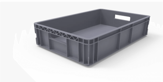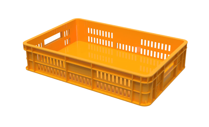 Canasta rígida con diseño perforado en barras, ventilación óptima y manija ergonómica. Ligera y resistente, con ranuras para sunchar y fácil transporte.
